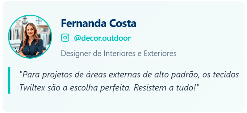 Todos os nossos tecidos contam com proteção UV total e são 100% impermeáveis. Foram desenvolvidos especialmente para resistir às condições mais extremas — sol intenso, chuva, maresia e variações de temperatura — mantendo sua aparência e desempenho por muito mais tempo.